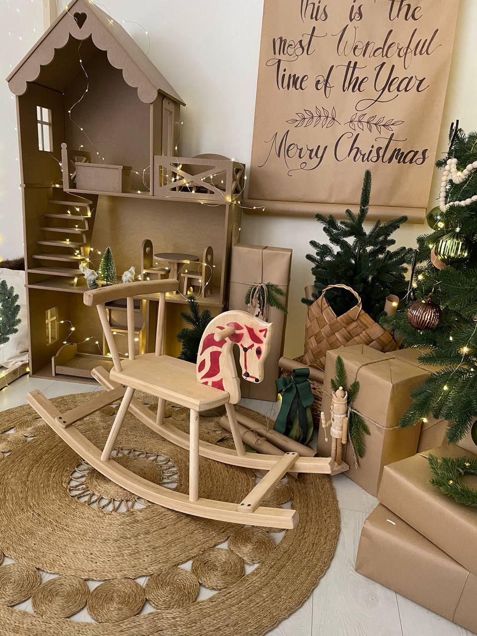 Виготовлений із вільхи або липи. Допоможе вашій дитині у великій моториці. Завдяки цій іграшці ваша дитина навчиться володіти і керувати своїм тілом. У коника є ручки завдяки, яким дитині зручно буде розгойдуватися. Іграшка виготовлена так, що навіть при сильному розгойдуванню не перевертається