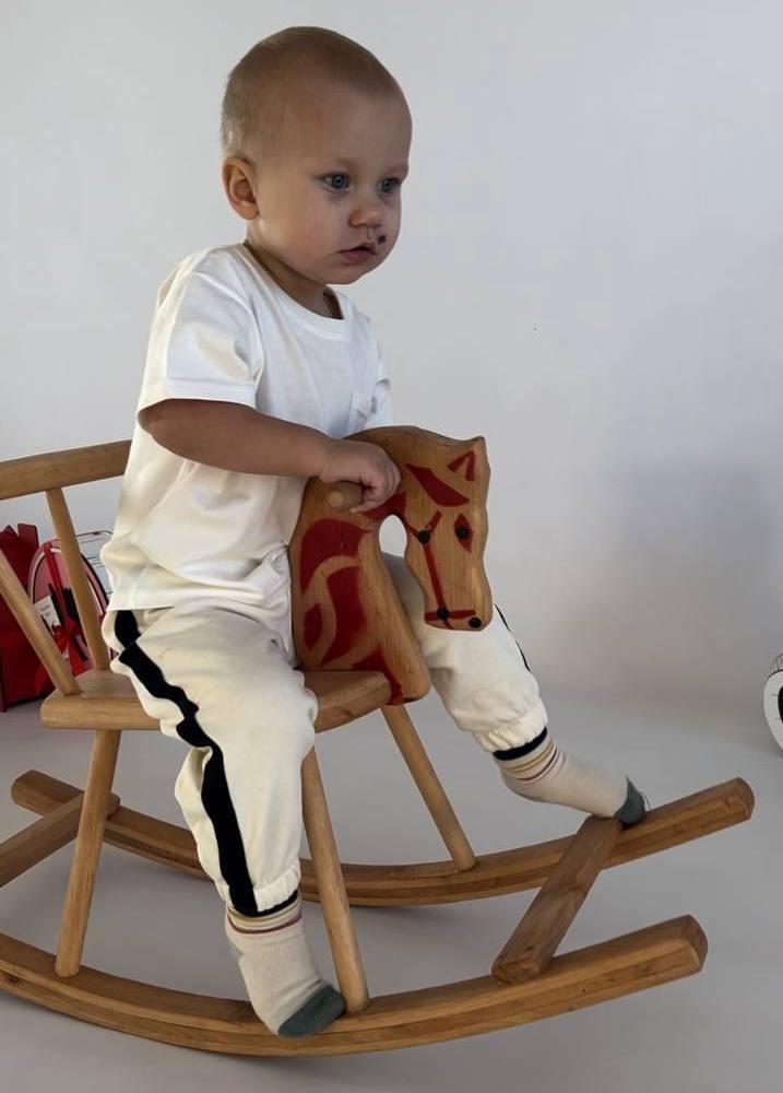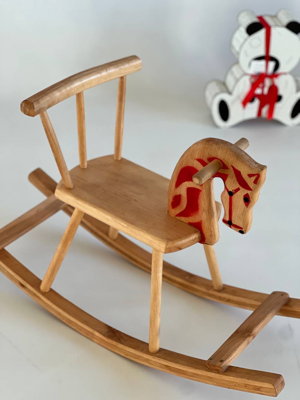 Виготовлений із вільхи або липи. Допоможе вашій дитині у великій моториці. Завдяки цій іграшці ваша дитина навчиться володіти і керувати своїм тілом. У коника є ручки завдяки, яким дитині зручно буде розгойдуватися. Іграшка виготовлена так, що навіть при сильному розгойдуванню не перевертається